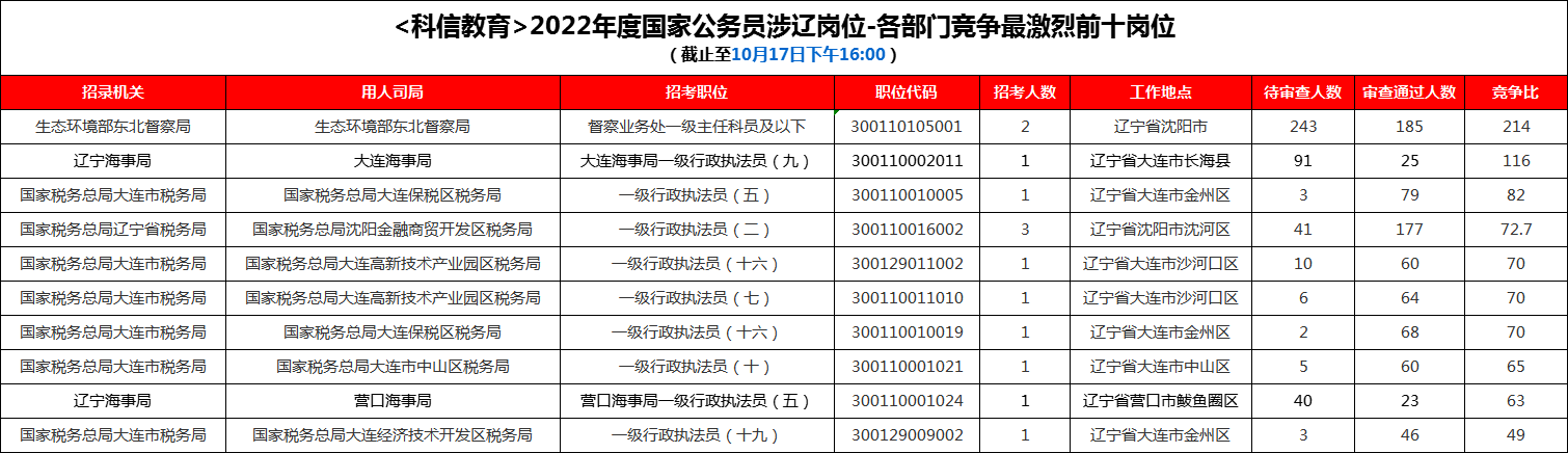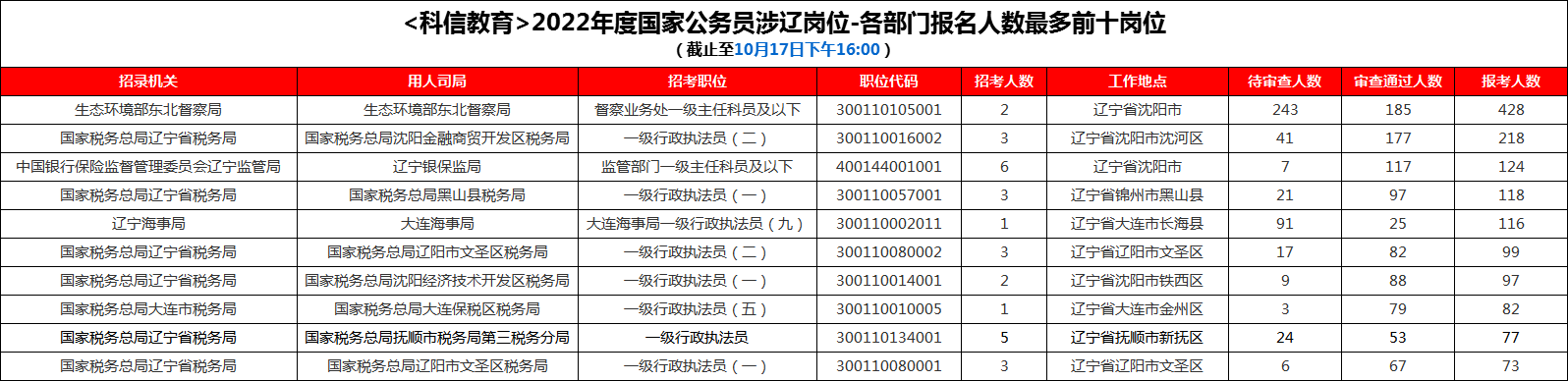 一、国考涉辽各部门中报名人数前十的岗位