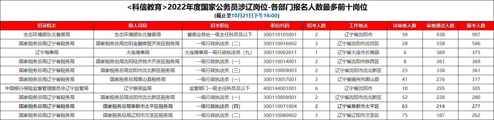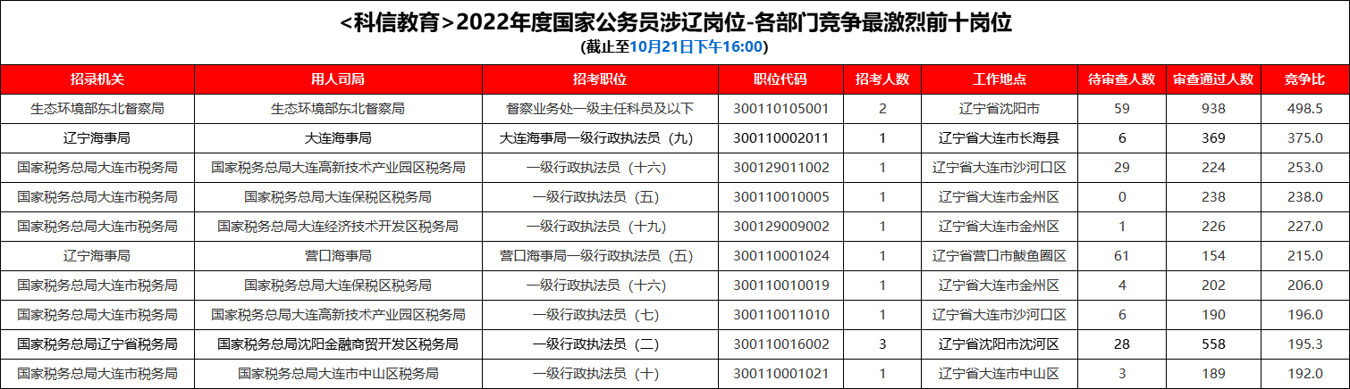 截至21日16时,排在第一位的仍然是“生态环境部东北督察局”所招录的“督察业务处一级主任科员及以下”职位,此职位一直处于竞争比最高的首位。竞争比高达498.5:1,成为最难考职位,报名人数997人,仅招录2人,通过审核人数已达938人。具体信息如下: