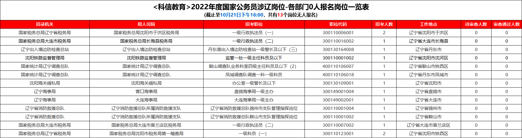 2022国考辽宁地区共713个岗位,截至21日16时,仅有13个岗位无人报名,与昨日相比减少了1/2。其中无人报考岗位中税务系统由昨日的12个减少为4个。