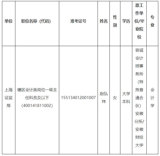 根据2023年度中央机关及其直属机构考试录用公务员工作有关要求,经笔试、面试、体检和考察等程序,确定赵弘玮(因怀孕延迟考察体检)为中国证监会上海监管局拟录用工作人员,现予以公示。公示期间如有问题,请向我会反映。