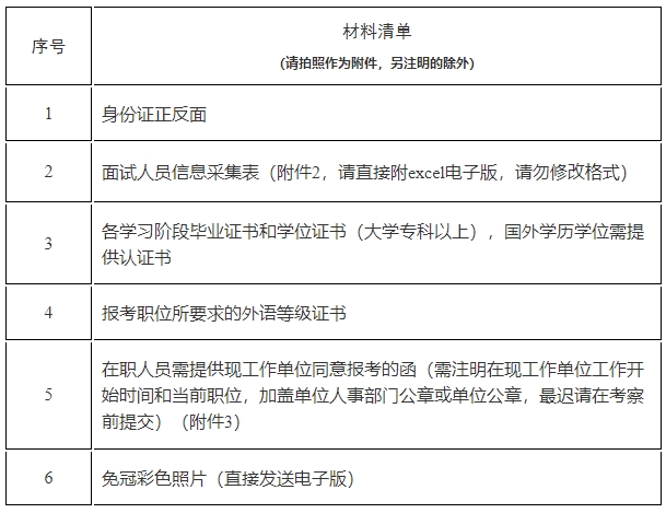 4.确认参加面试者,需以电子邮件附件形式提供相关材料,所需材料清单及要求见下表。考生本人对所提供材料的真实性负责,材料不全或主要信息不实,影响资格审查结果的,将取消面试资格。