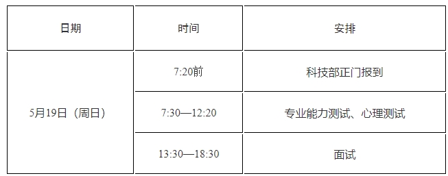 1.我部将集中进行专业能力测试和面试等,采用现场面试的方式进行,时间为2024年5月19日,具体安排如下。