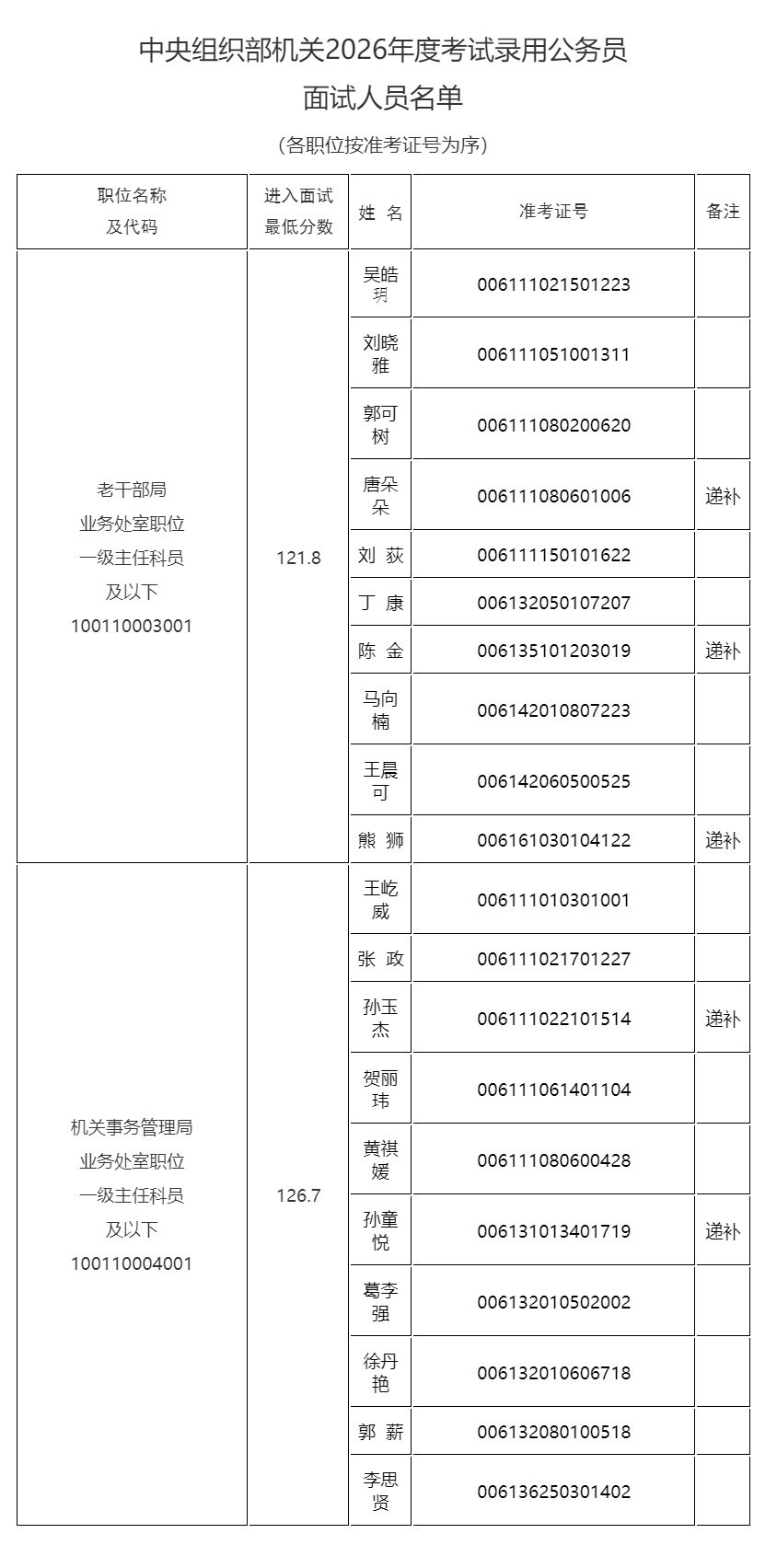 附件:中央组织部机关2026年度考试录用公务员面试人员名单
