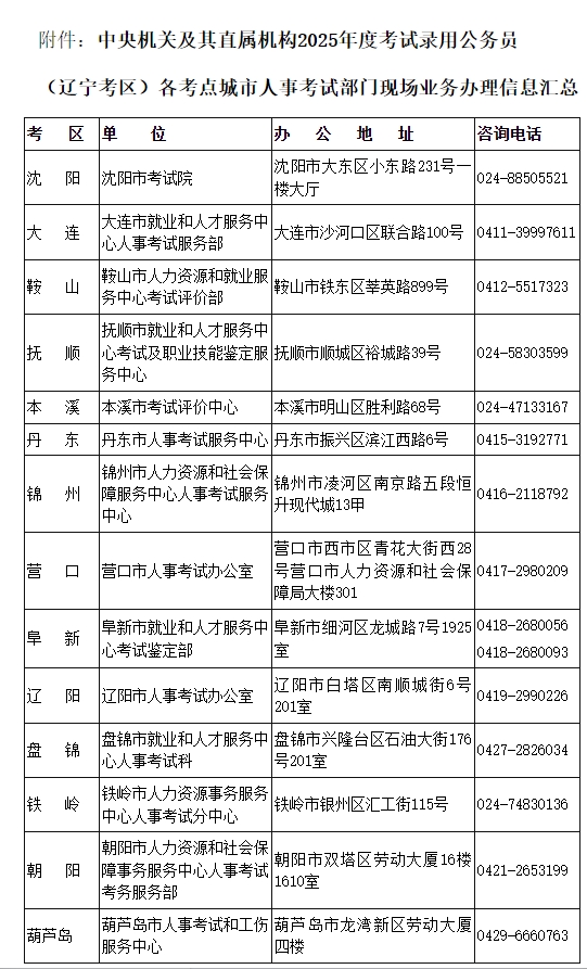 附件:中央机关及其直属机构2025年度考试录用公务员(辽宁考区)各考点城市人事考试部门现场业务办理信息汇总(详见辽宁人事考试网)