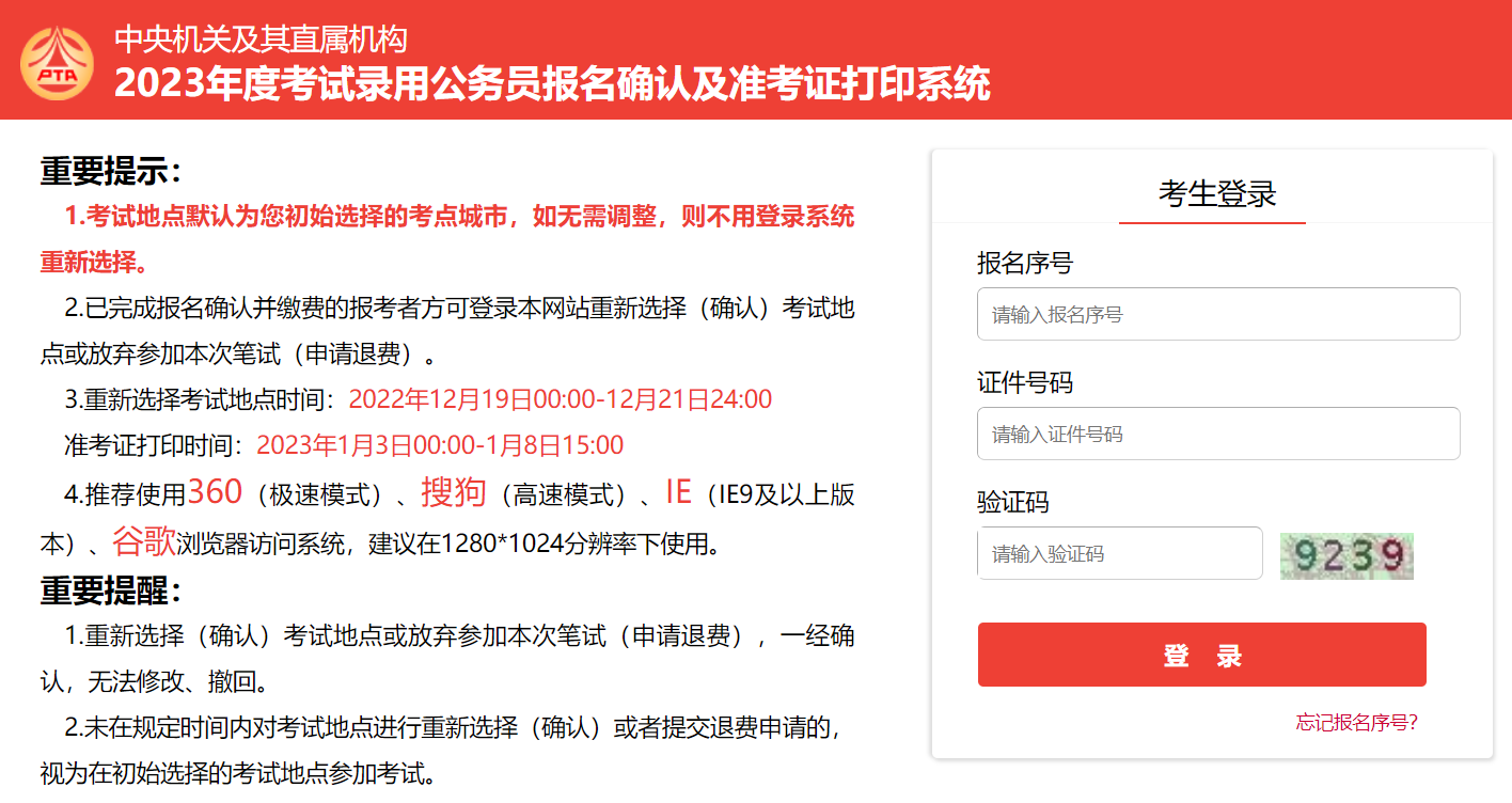中央机关及其直属机构 2023年度考试录用公务员报名确认及准考证打印系统