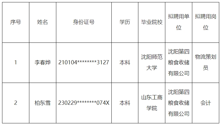 沈阳盛京资产管理集团有限公司所属子公司沈阳粮油集团有限公司所属子公司沈阳第四粮食收储有限公司拟聘用人员公示