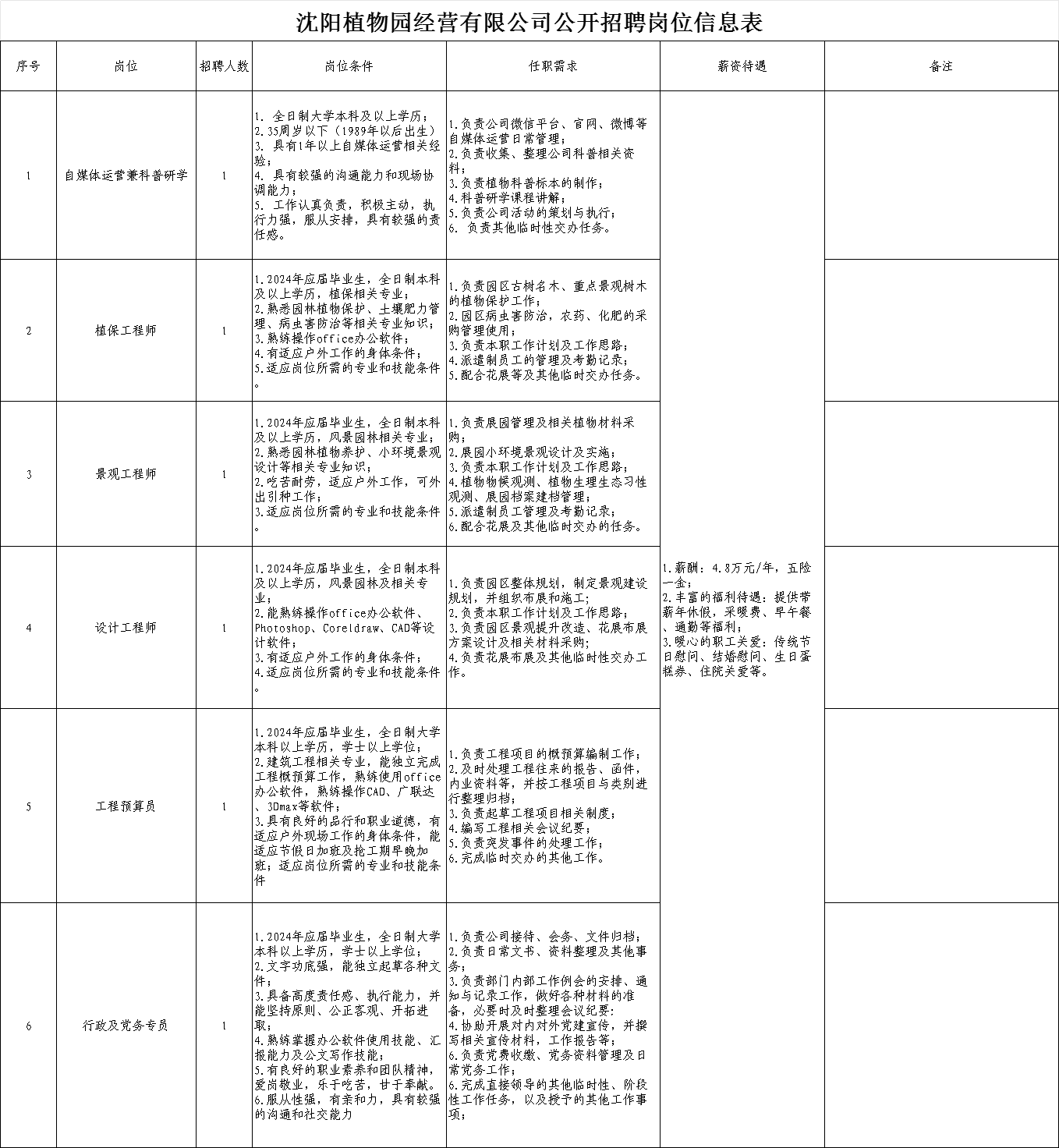 详见附件1《沈阳植物园经营有限公司公开招聘岗位信息表》。
