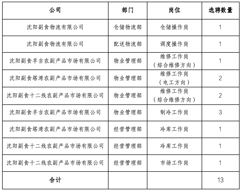 沈阳副食集团是沈阳市国资委出资的大型国有流通企业集团,是市管国有重要骨干企业之一,是沈阳市人民政府菜篮子工程的重要载体。为进一步加大人才公开选拔力度,拓宽选人、用人渠道,根据工作需要,面向集团内外部社会化选聘所属公司人才。