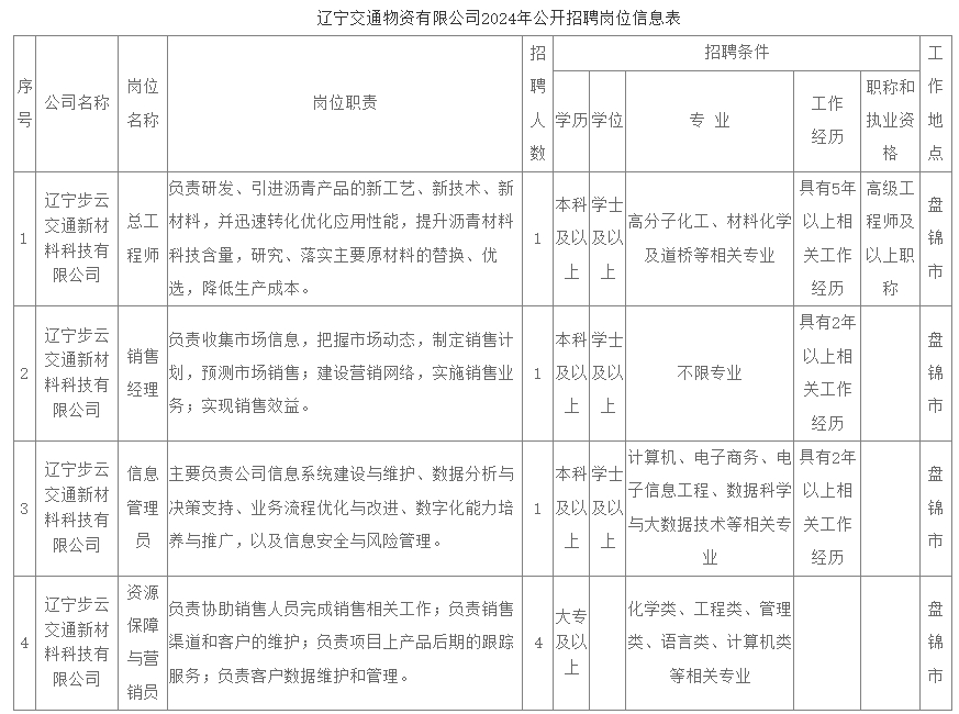 为满足业务新发展需求,本着人岗匹配、适中选优的原则,辽宁交通物资有限公司下属辽宁步云交通新材料科技有限公司拟面向社会公开招聘7名工作人员(具体岗位见《辽宁交通物资有限公司2024年公开招聘岗位信息表》),现公告如下: