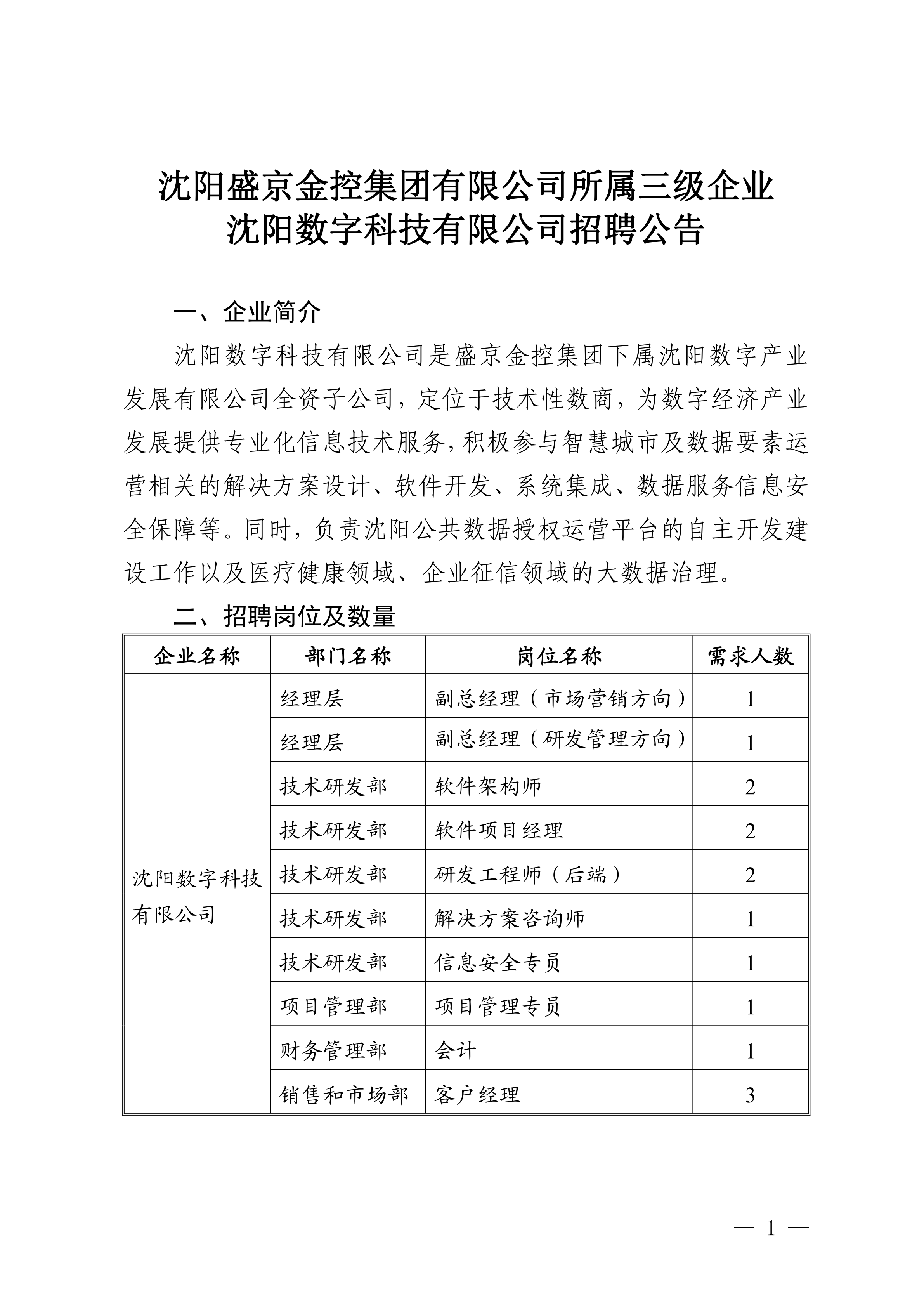 沈阳盛京金控集团有限公司所属二级企业沈阳数字产业发展有限公司招聘5人公告