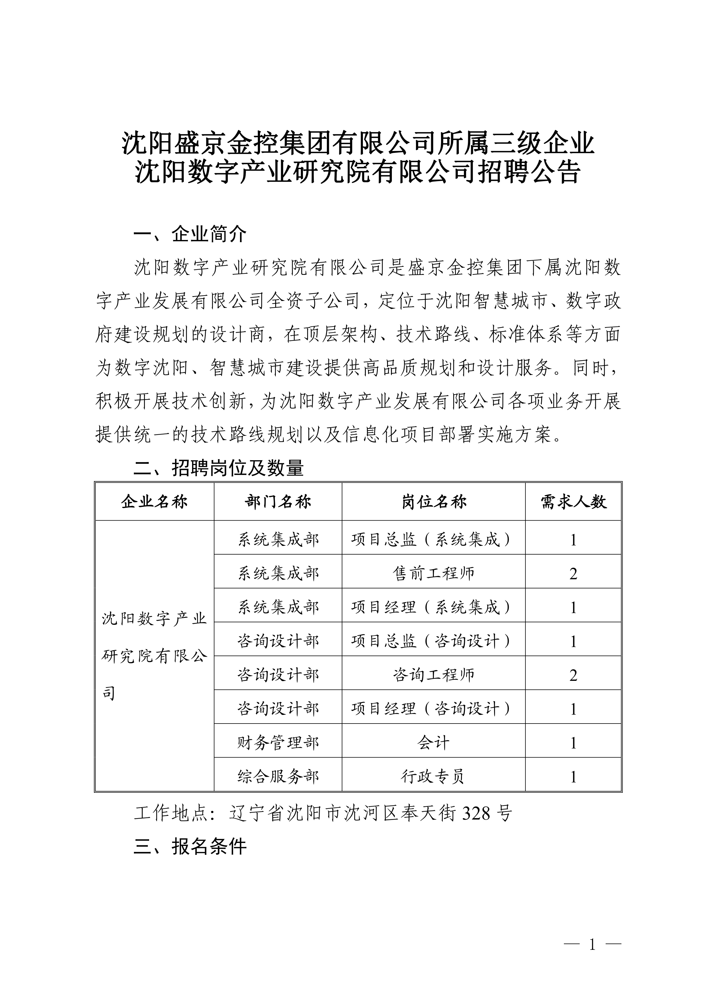 沈阳盛京金控集团有限公司所属三级企业沈阳数字产业研究院有限公司招聘10人公告
