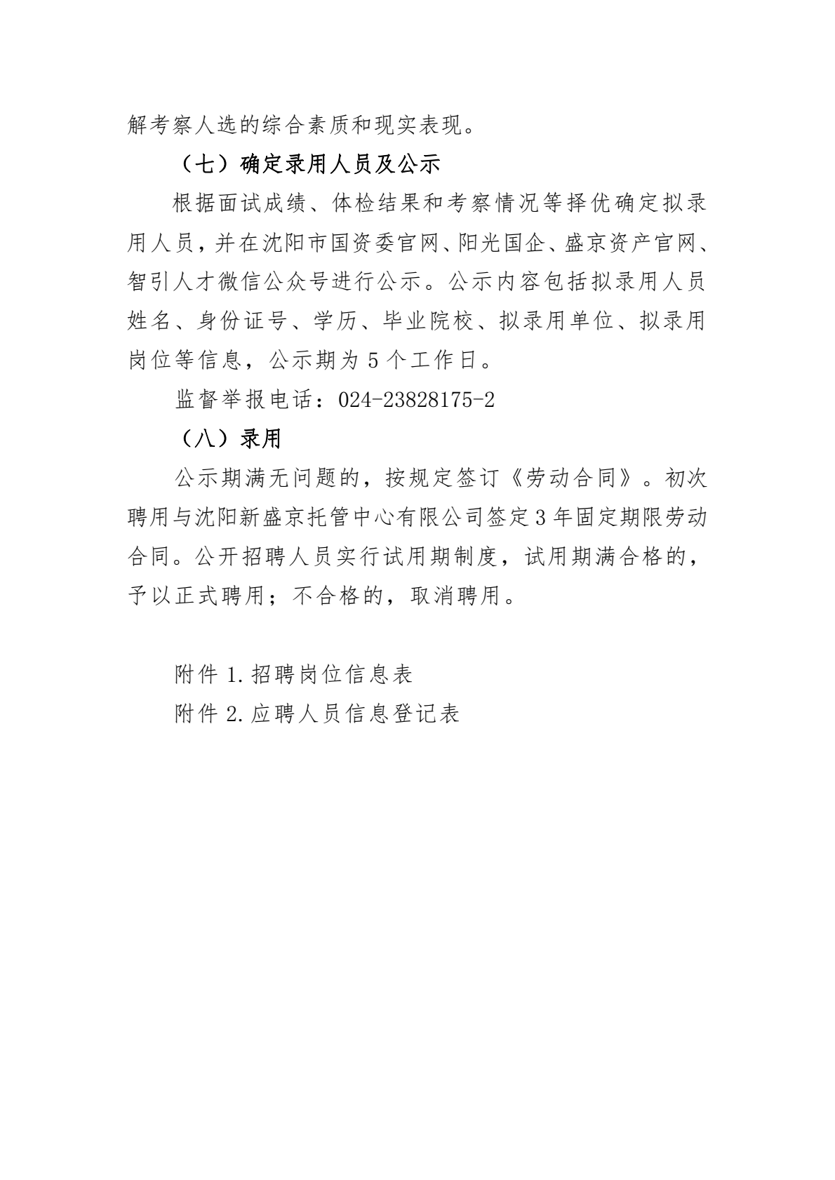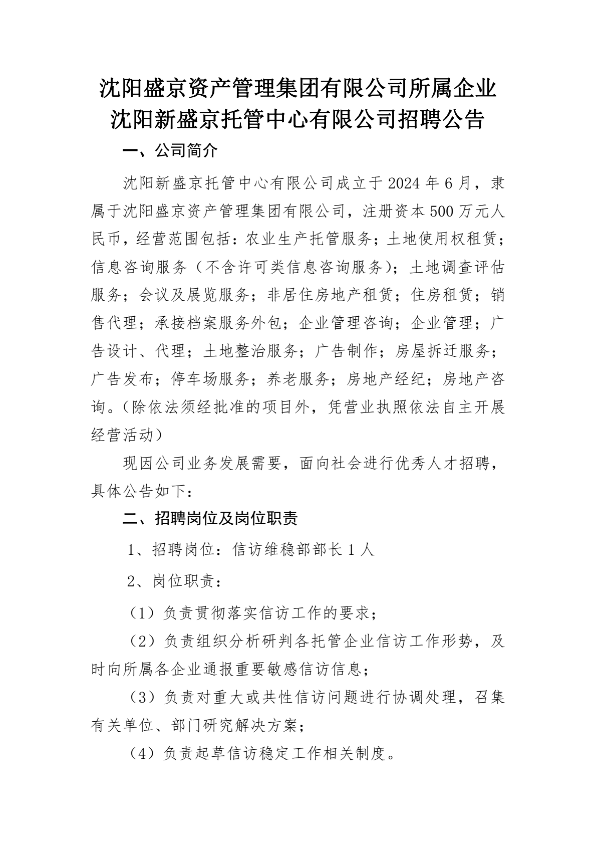 沈阳盛京资产管理集团有限公司所属企业沈阳新盛京托管中心有限公司招聘1人公告
