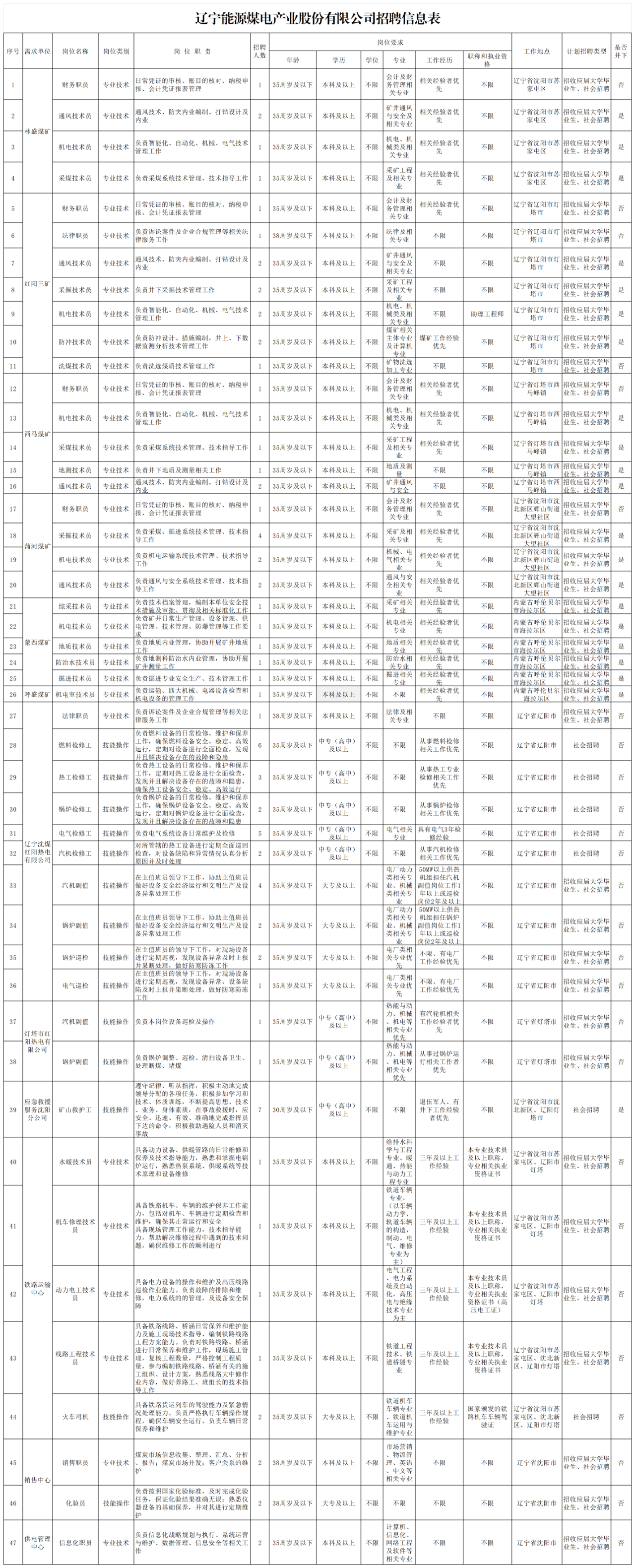 招聘岗位及要求详见《辽宁能源煤电产业股份有限公司招聘信息表》(附件1),条件特别优秀者可适当放宽。