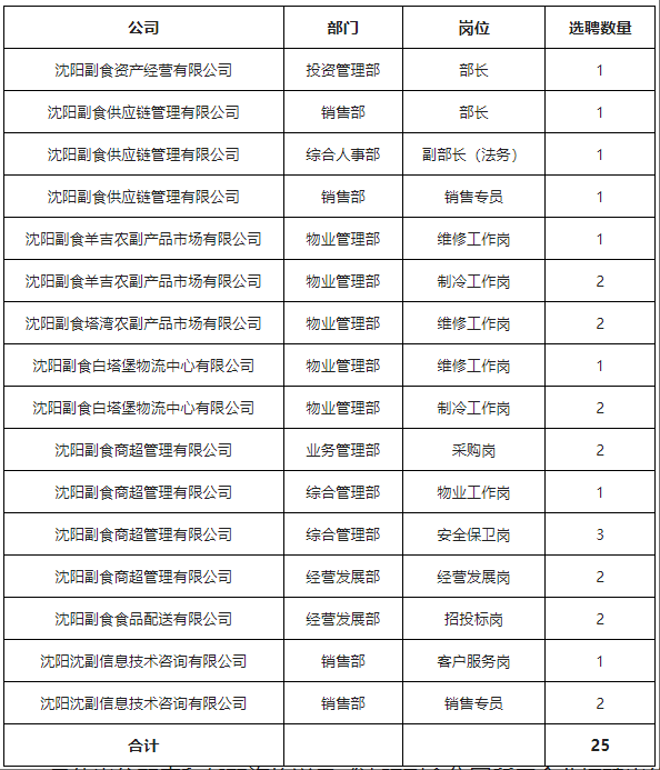 沈阳副食集团是沈阳市国资委出资的大型国有流通企业集团,是市管国有重要骨干企业之一,是沈阳市人民政府菜篮子工程的重要载体。为进一步加大人才公开选拔力度,拓宽选人、用人渠道,根据工作需要,面向集团内外部市场化选聘企业人才。