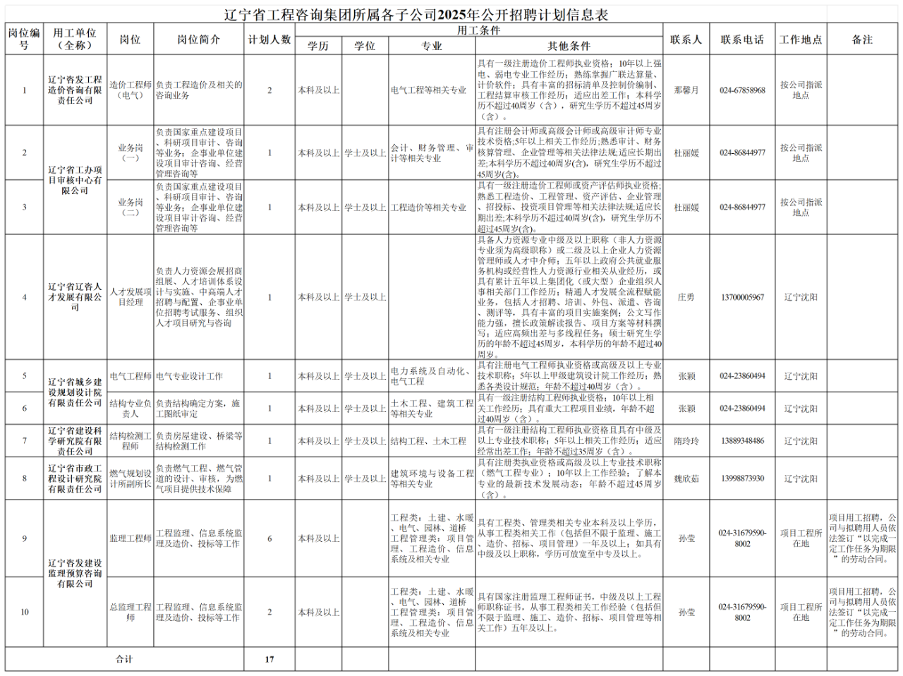(六)招聘联系方式:具体岗位咨询电话详见《辽宁省工程咨询集团所属各子公司2025年公开招聘计划信息表》联系人、联系电话(周一至周五上午8:30-11:30,下午1:30-5:00)。
