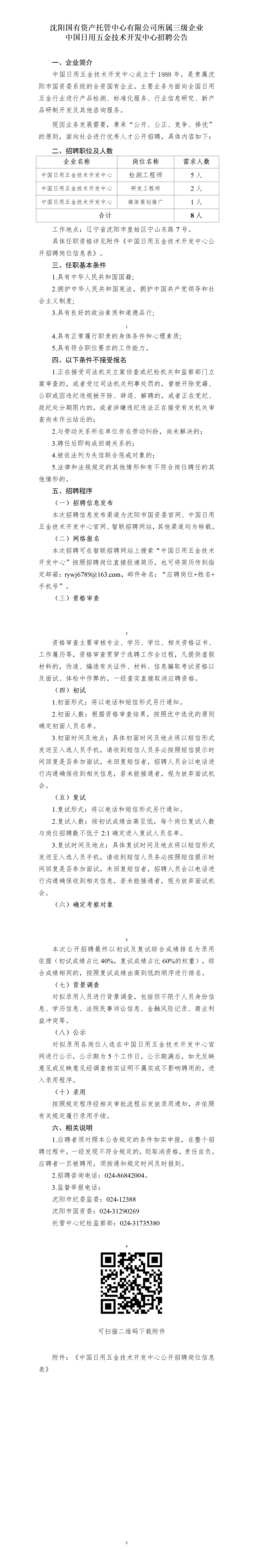 沈阳国有资产托管中心有限公司所属三级企业中国日用五金技术开发中心招聘8人公告