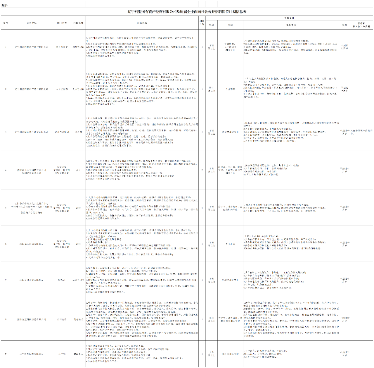 具体详见:附件《辽宁利盟国有资产经营有限公司及所属企业面向社会公开招聘岗位计划信息表》。