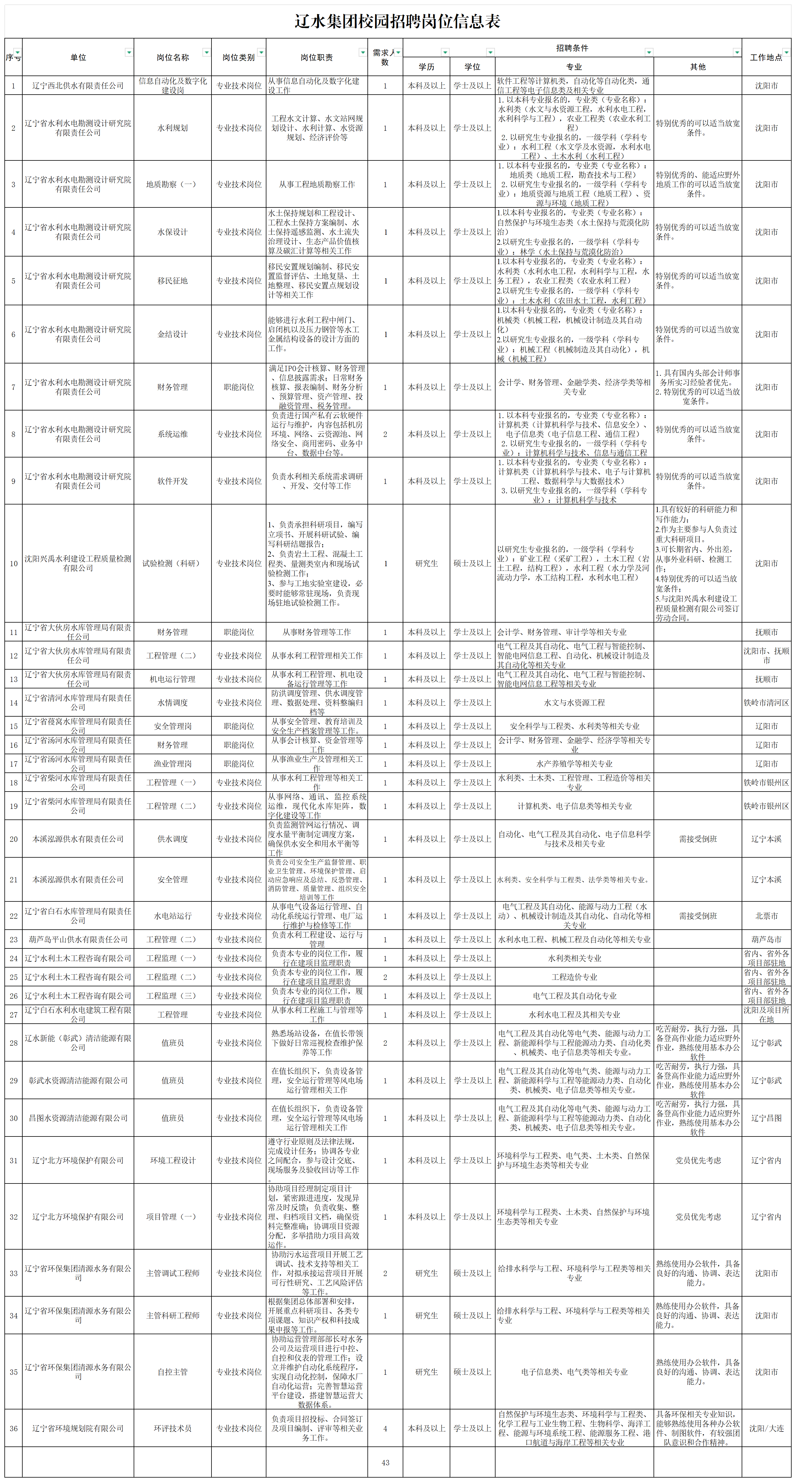 本次招聘共43人,具体岗位及要求详见《辽水集团校园招聘岗位信息表》(附件1)。