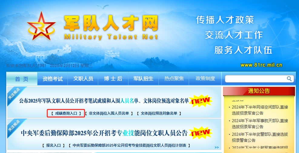 2025年军队文职人员公开招考笔试成绩查询入口