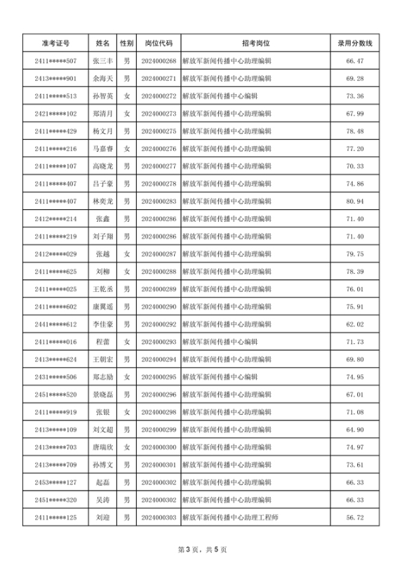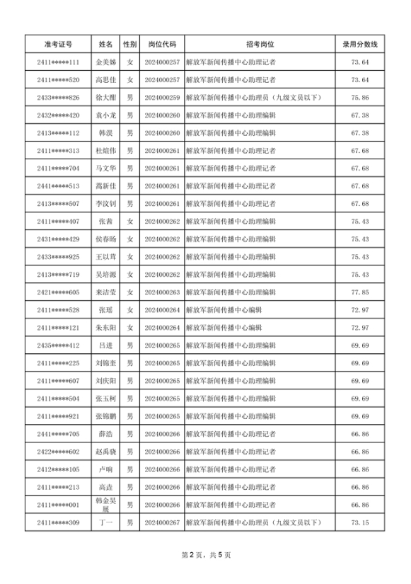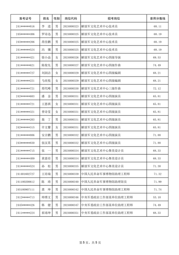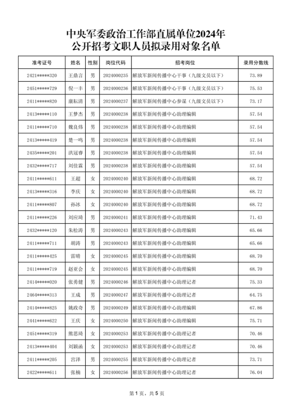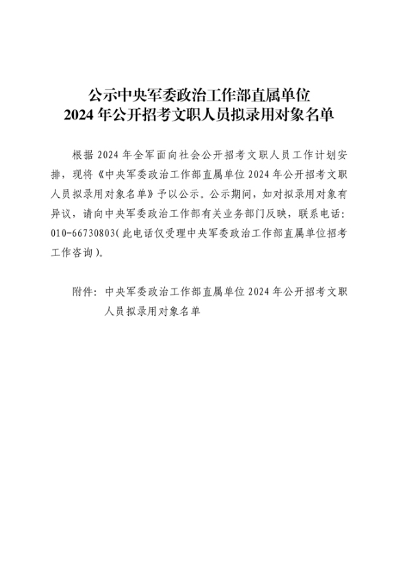 公示中央军委政治工作部直属单位2024年公开招考文职人员拟录用对象名单
