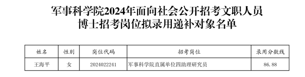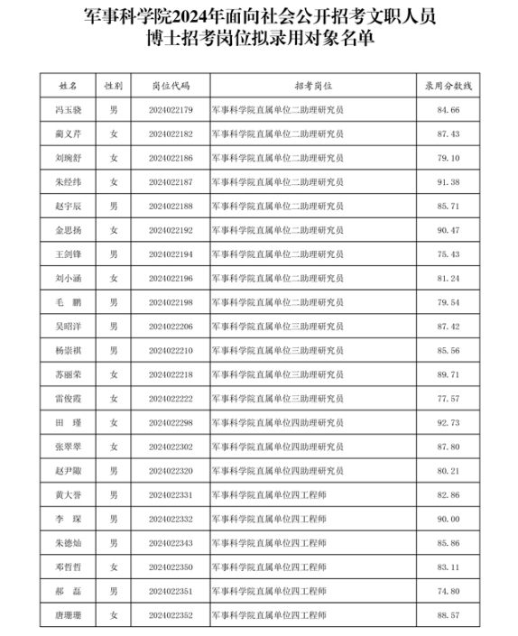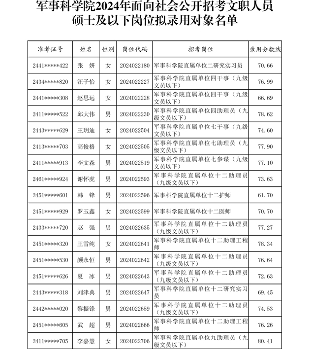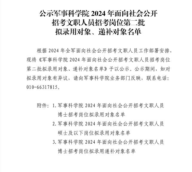 公示军事科学院2024年面向社会公开招考文职人员招考岗位第二批拟录用对象、递补对象名单