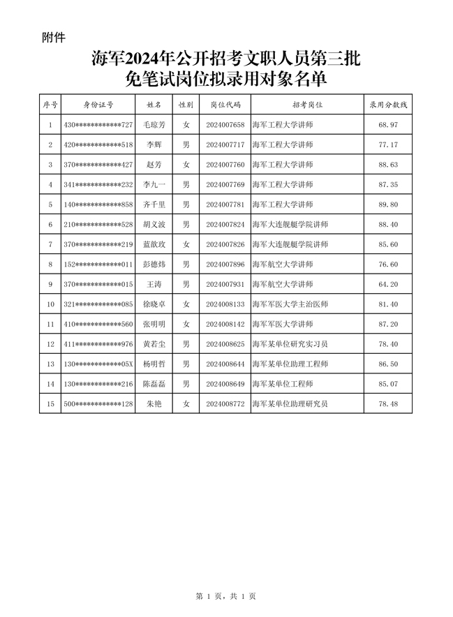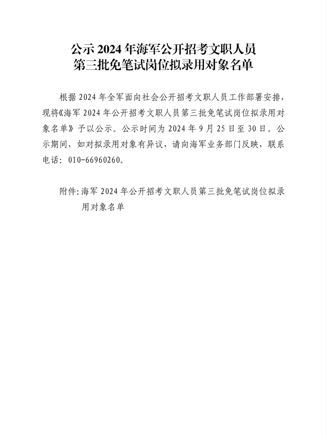 公示2024年海军公开招考文职人员第三批免笔试岗位拟录用对象名单