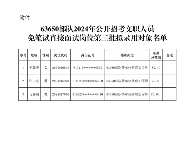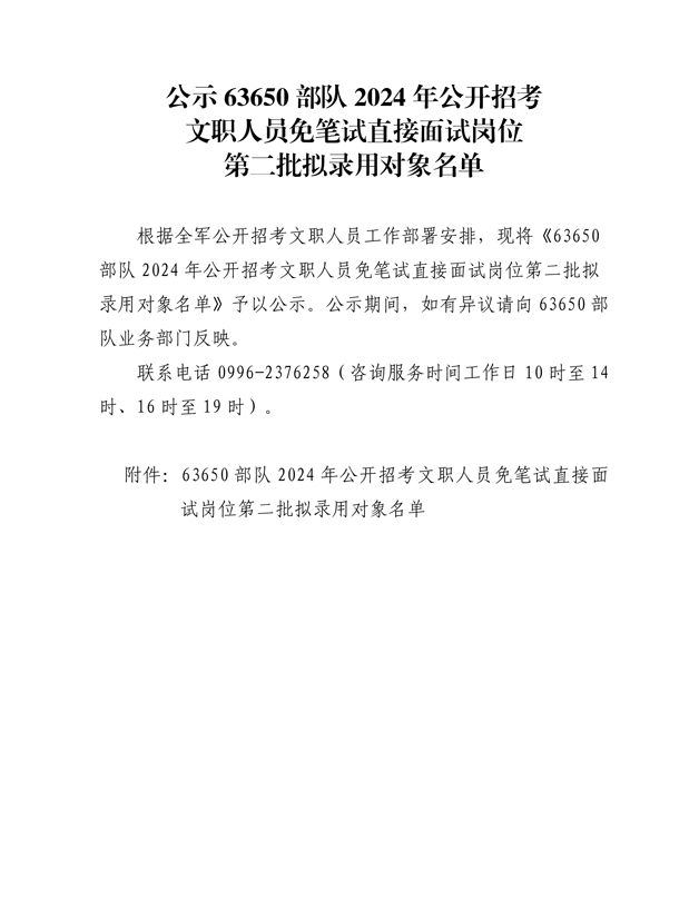 公示63650部队2024年公开招考文职人员 免笔试直接面试岗位第二批拟录用对象名单
