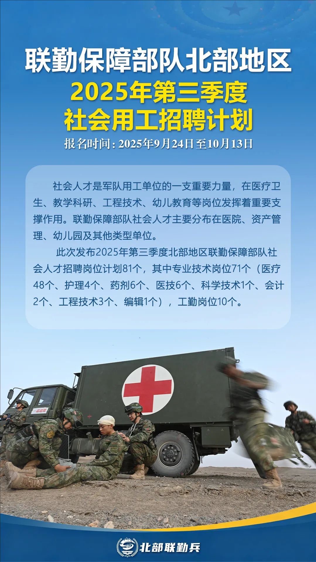 此次发布2025年第三季度北部地区联勤保障部队社会人才招聘岗位计划81个,其中专业技术岗位71个(医疗48个、护理4个、药剂6个、医技6个、科学技术1个、会计2个、工程技术3个、编辑1个),工勤岗位10个。