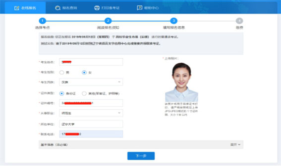 (3)填写完整的个人信息后,上传电子版个人近期1寸免冠照片,不得上传修饰的照片,背景颜色无要求,尺寸为390*567,格式为jpg,大小不超过1M。认真审核所填信息,无误后点击“下一步”按钮(点击此按钮后信息无法进行修改),如信息有误、照片不符合要求报名无效;