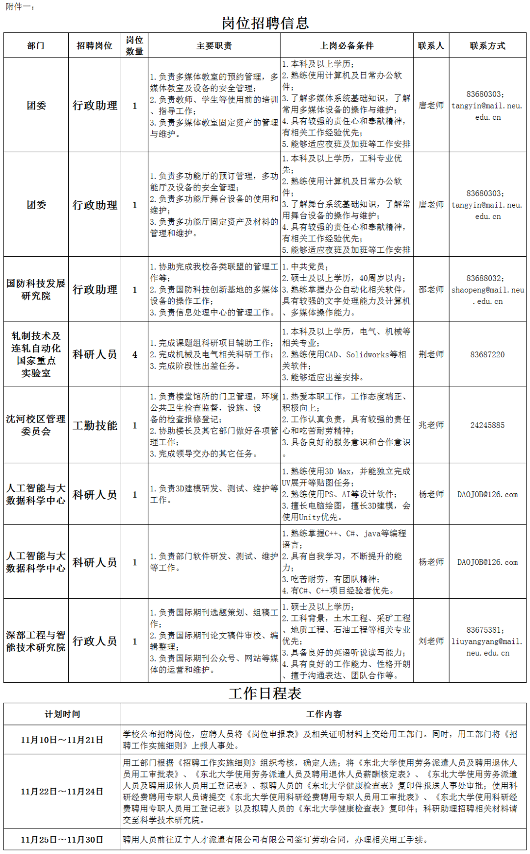 (一)相应岗位具体情况、招聘工作日程及联系人见附件一。(见下图)