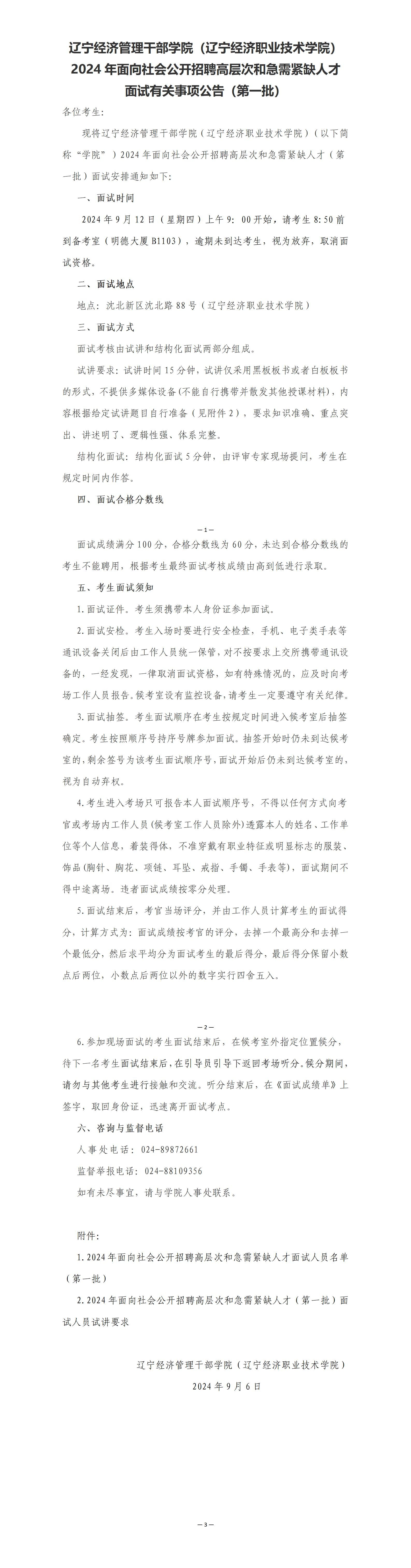辽宁经济管理干部学院(辽宁经济职业技术学院)2024年面向社会公开招聘高层次和急需紧缺人才面试有关事项公告(第一批)