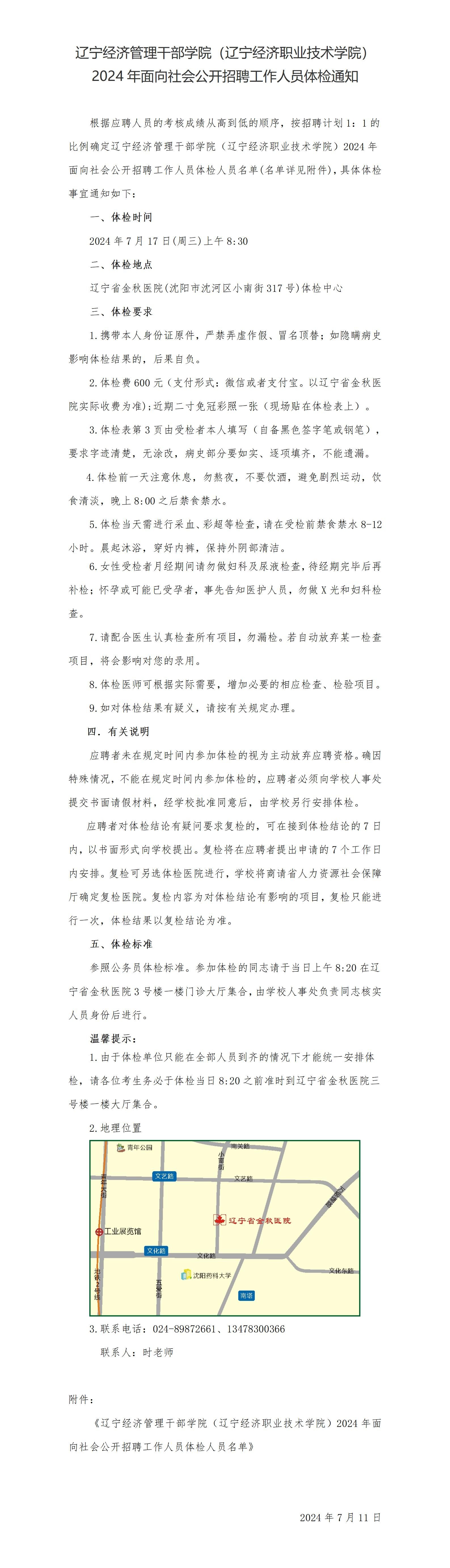 辽宁经济管理干部学院(辽宁经济职业技术学院)2024年面向社会公开招聘工作人员体检通知