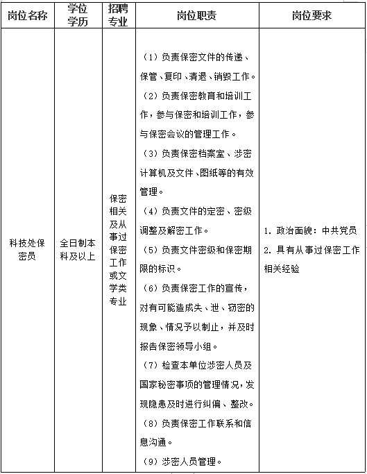 沈阳工学院是经国家教育部批准设立的一所民办普通本科高等学校,创建于1999年。学校位于沈阳、抚顺两个特大工业型城市区域交界处,地处辽宁省和东北亚中心地带的“沈抚改革创新示范区”,校园北依浑河,交通便利、环境优雅、景色宜人。现有全日制本专科生和留学生19000余人,设有13个教学单位,在42个本科专业和6个专科专业招生。目前沈阳工学院二级保密资质正在顺利进行,为保障保密资质的顺利获批及保密办的各项工作开展,现根据学校发展需要,现面向社会公开招聘科技处保密员一名。