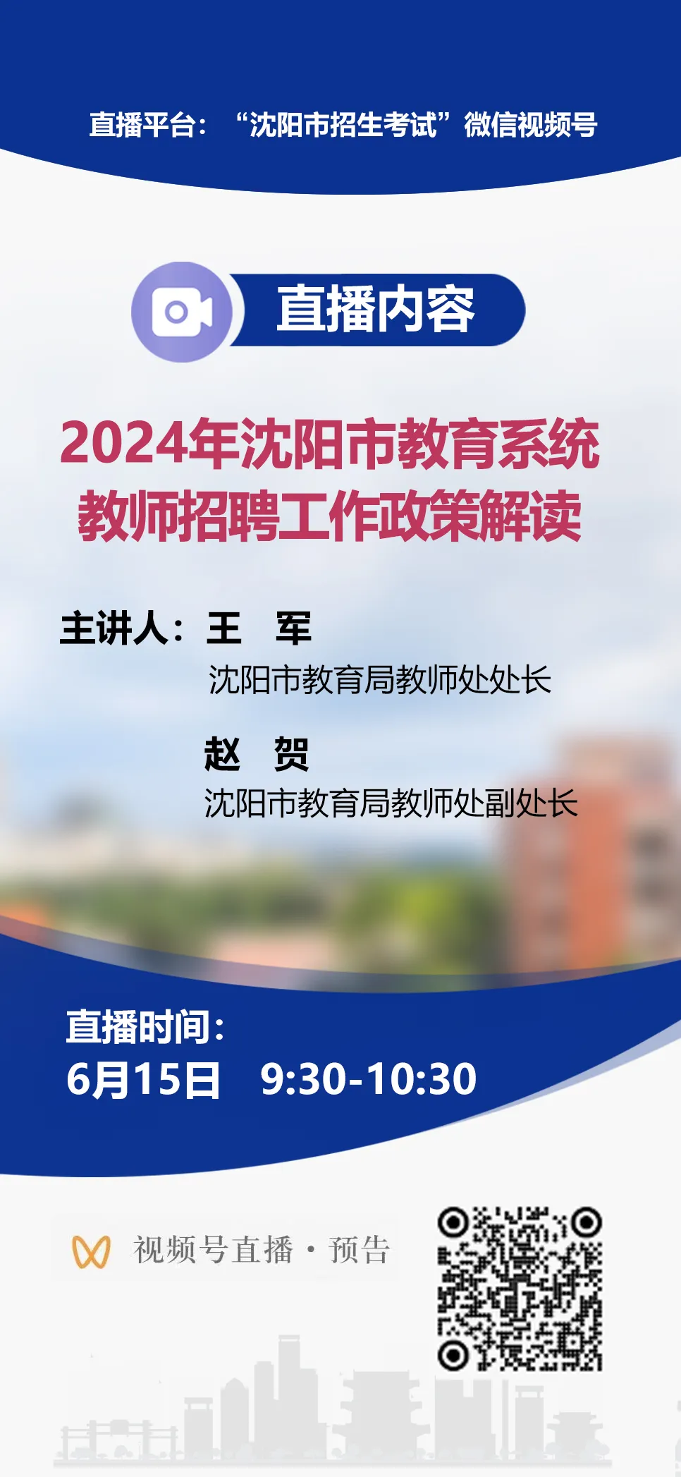 直播预告丨2024年沈阳市教育系统教师招聘工作政策解读6月15日9:30开播