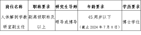 根据《中国医科大学教学、科研、临床工作单元主任(副主任)管理办法》(医大党发〔2024〕95号)文件和学院实际工作需要,现启动人体解剖学教研室副主任岗位聘任工作,具体通知如下:
