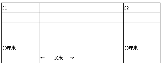 测试方法为:受测者用站立式起跑,听到发令后从S1线外起跑,当跑到S2线前面,用一只手拿起一木块随即往回跑,跑到S1线前时交换木块,再跑回S2交换另一木块,最后持木块冲出S1线,记录跑完全程的时间。记录以秒为单位,取一位小数,第二位小数非“0”时则进1。