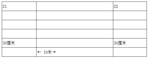 受测者用站立式起跑,听到发令后从S1线外起跑,当跑到S2线前面,用一只手拿起一木块随即往回跑,跑到S1线前时交换木块,再跑回S2交换另一木块,最后持木块冲出S1线,记录跑完全程的时间。记录以秒为单位,取一位小数,第二位小数非“0”时则进1。注意事项:当受测者取放木块时,脚不要越过S1和S2线;10米×4往返跑项目测评次数不超过2次。