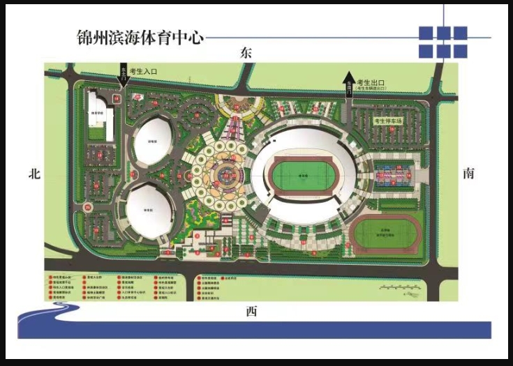 锦州滨海体育中心(锦州市滨海新区渤海大街六段6号)。交通方式:从锦州火车站乘坐虎跃到崔庄子站下车,或从锦州南站乘702路公交车到龙脉海景站下车。考生从体育中心东侧北门入场;东南门设有考生车辆停车场(见附件2示意图)。