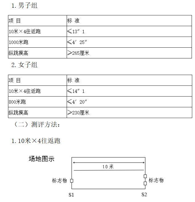受测试者采用站立式起跑,听到发令后从S1线外跑到S2线前(脚不得踩线)用手将竖立的木块推倒后折返,往返跑2次,每次推倒1个木块,第2次返回时冲出S1线,记录跑完全程时间。成绩以“秒”为单位,保留1位小数,第2位小数非“0”则进1。按组别进行测试,每人最多可测2次,1次测评达标,即视为该项目测评合格。