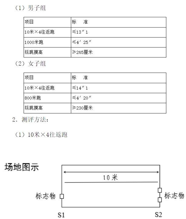 受测试者统一采用站立式起跑姿势,在起跑线外听到或看到发令信号时开始起跑,跑完相应距离越过终点线后视为完成测试。按组别进行测试,每人最多可测1次。
