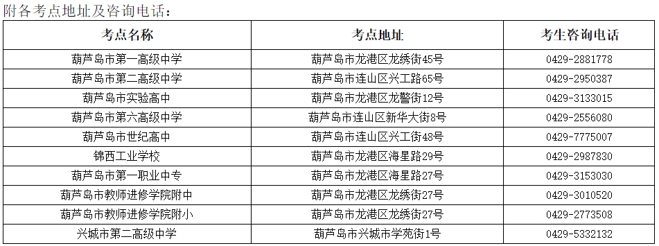 1. 考生应提前打印准考证,提前熟悉考场地址和交通路线,葫芦岛考区各考点地址、咨询电话附后。