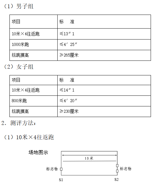 受测试者统一采用站立式起跑姿势,在起跑线外听到或看到发令信号时开始起跑,跑完相应距离越过终点线后视为完成测试。按组别进行测试,每人最多可测1次。