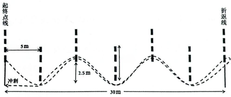 ①场地设置:在标准的田径场跑道上(道宽1.25m)或平整的场地上,划两条间隔30m的平行线,作为起终点线和折返线。器材:在两条间隔2.5m的跑道分道线上直线相距5m处,设置1根立杆,共设7根立杆,立杆高度不低于1.2m(如图1-1)。