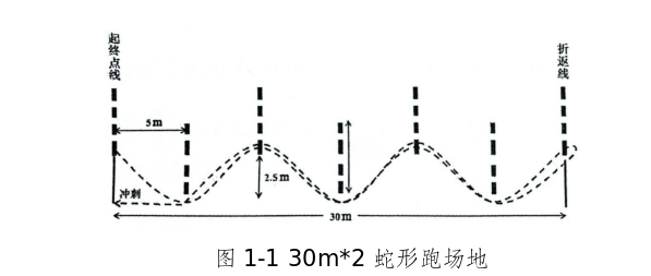 ①场地设置:在标准的田径场跑道上(道宽1.25m)或平整的场地上,划两条间隔30m的平行线,作为起终点线和折返线。器材:在两条间隔2.5m的跑道分道线上直线相距5m处,设置1根立杆,共设7根立杆,立杆高度不低于1.2m(如图1-1)。