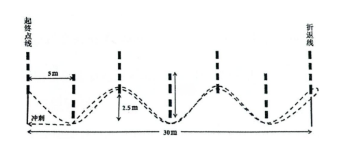 ①场地设置:在标准的田径场跑道上(道宽1.25m)或平整的场地上,划两条间隔30m的平行线,作为起终点线和折返线。器材:在两条间隔2.5m的跑道分道线上直线相距5m处,设置1根立杆,共设7根立杆,立杆高度不低于1.2m(如图1-1)。