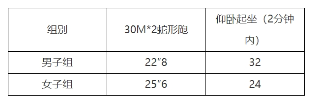 体能测试标准为: