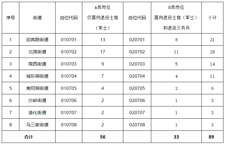 全区计划招录退役士兵89人,分为A类岗位和B类岗位。其中A类岗位仅面向退役士官(军士),B类岗位面向退役士官(军士)和退役义务兵。正式录用后,由街道根据实际情况安排到相应社区岗位工作。各街道招录计划见附件。