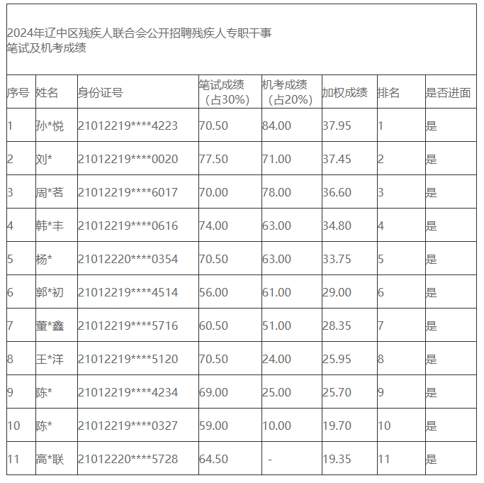 2024年辽中区残疾人联合会招聘残疾人专职干事招聘考试总成绩排名公告