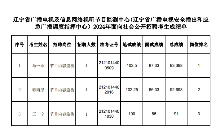 关于公布辽宁省广播电视及信息网络视听节目监测中心(辽宁省广播电视安全播出和应急广播调度指挥中心)2024年面向社会公开招聘考生考试成绩的公告