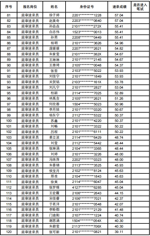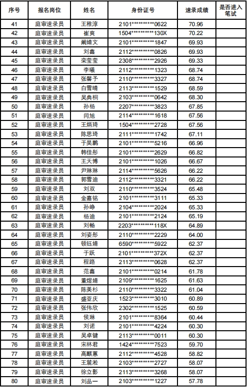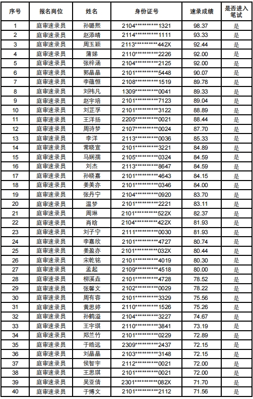沈河区人民法院2024年补录庭审速录员技能考试成绩公示